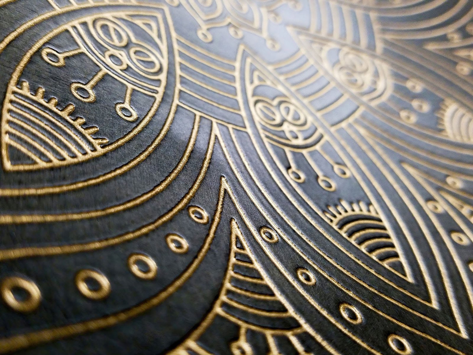 Close-up photo of an ornate black and gold metal plate.
