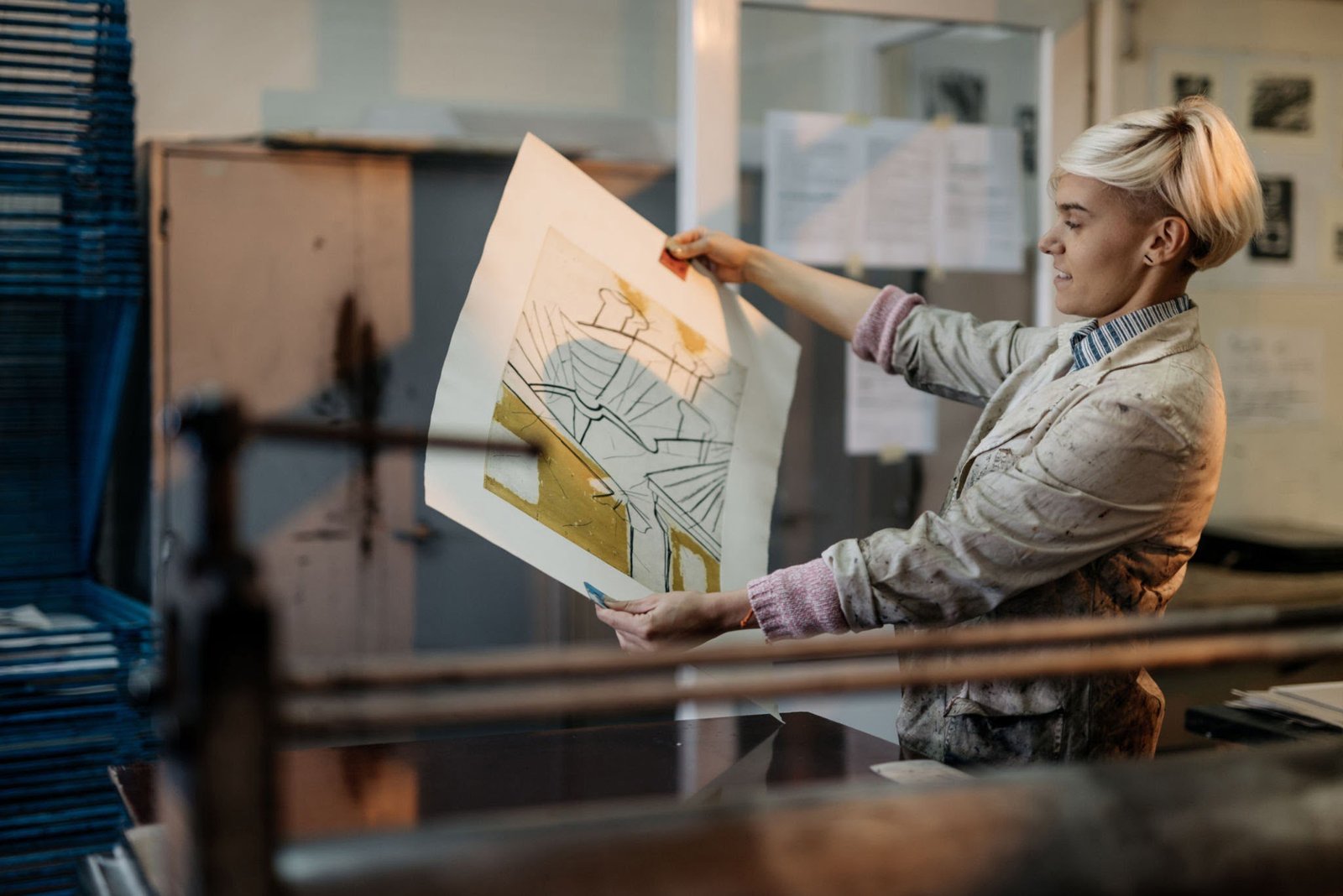 She is gritty and courageous. She is using her talent and artistic skill to produce unique etchings and lithograph prints and selling them to art lovers. Young woman is coming to workshop every morning, changing clothing and preparing colors, papers and moulds for work.
